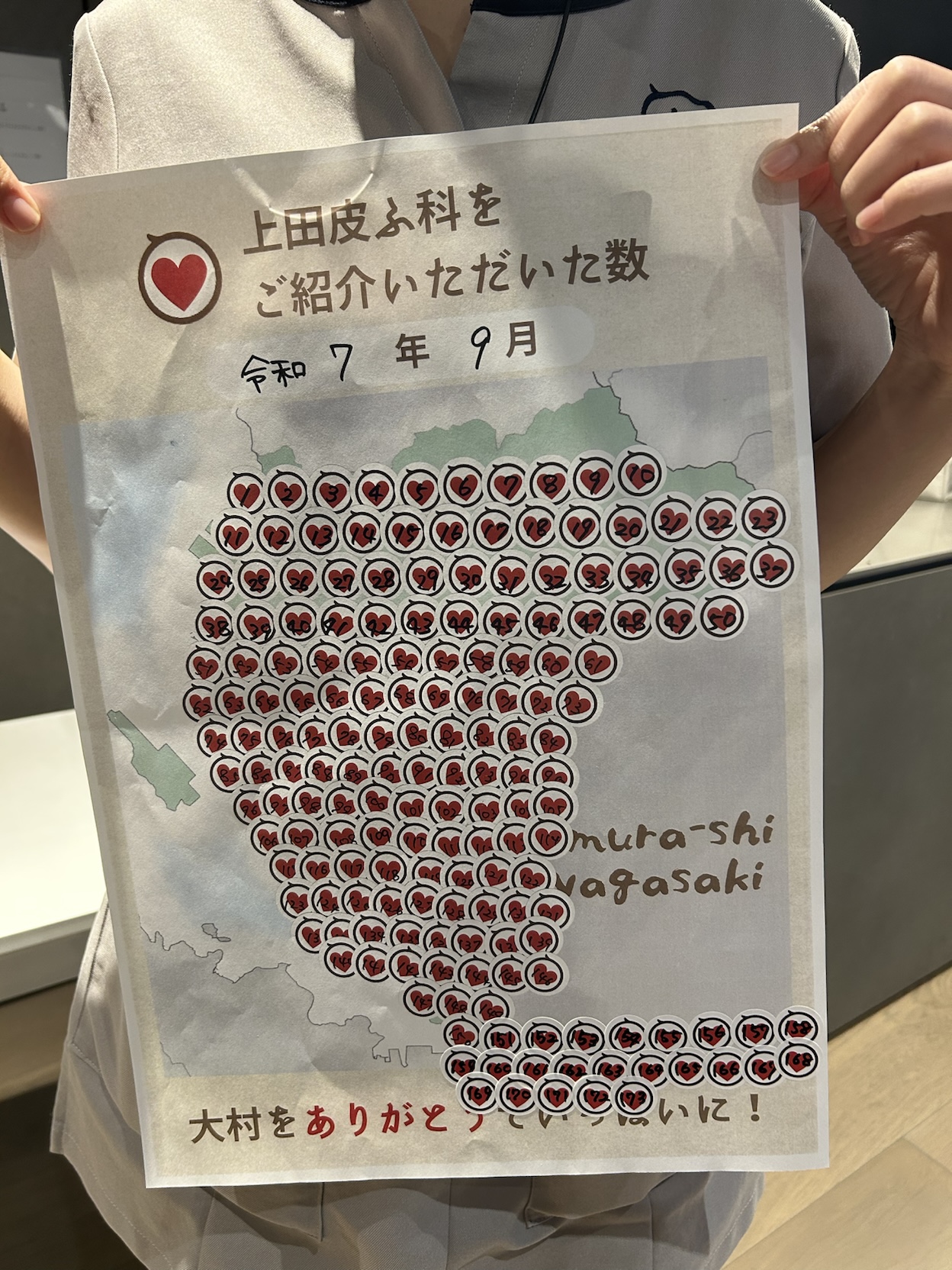 大村市の地図に「ご紹介で来院された方お一人につきハートのシールを1枚」貼り、