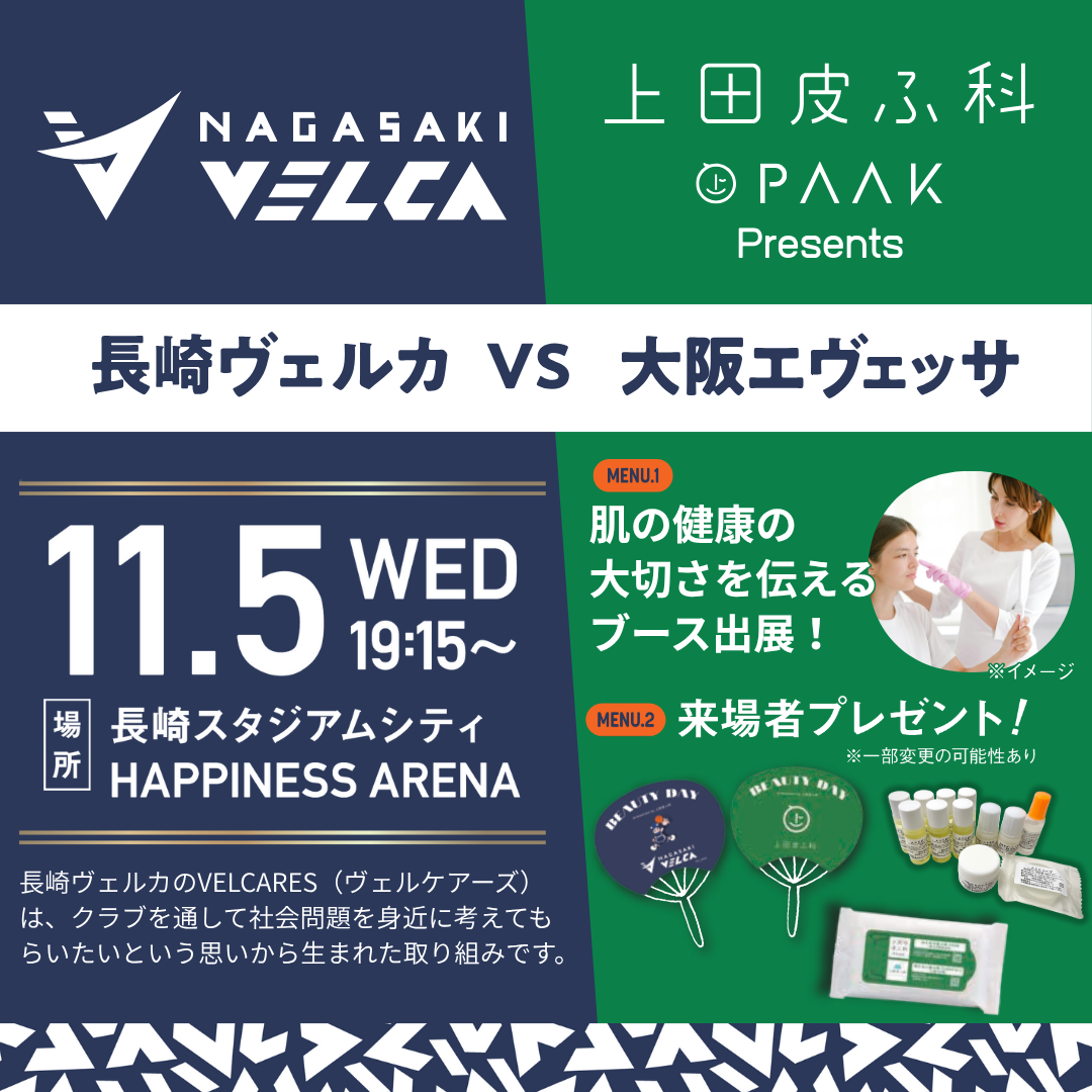 【長崎ヴェルカ】11月5日(水)上田皮ふ科PΛΛK 冠パートナーマッチ開催のお知らせ🏀