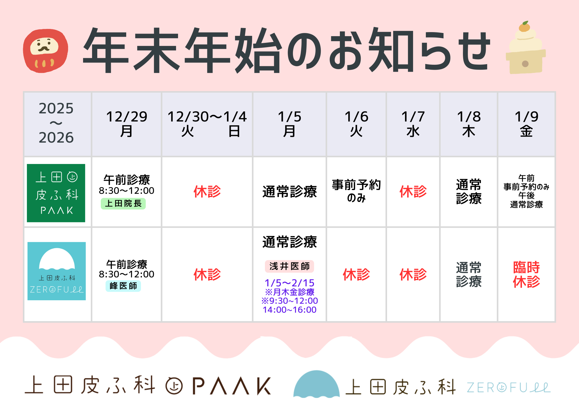 本年も上田皮ふ科をご信頼いただき、数あるクリニックの中から当院をお選びいただきましたこと、スタッフ一同、心より感謝申し上げます🌸