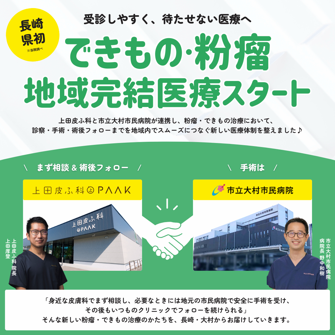 医療法人Palette 上田皮ふ科PΛΛK(長崎県大村市)と、公益社団法人地域医療振興協会 市立大村市民病院は、皮膚の粉瘤(アテローム)・脂肪腫など「できもの」治療における地域医療連携として