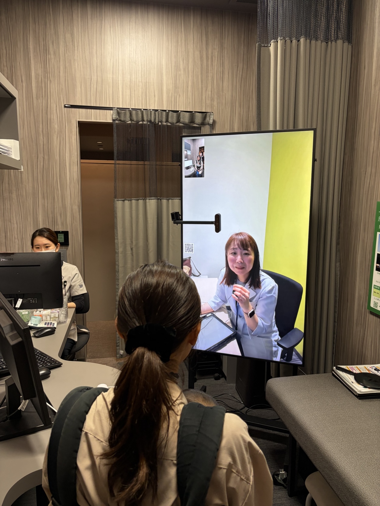 大型ディスプレイと高精細な映像・音響技術により、遠隔でも自然な会話や視線の一致が生まれ、対面に近い安心感のある診療体験につながります。