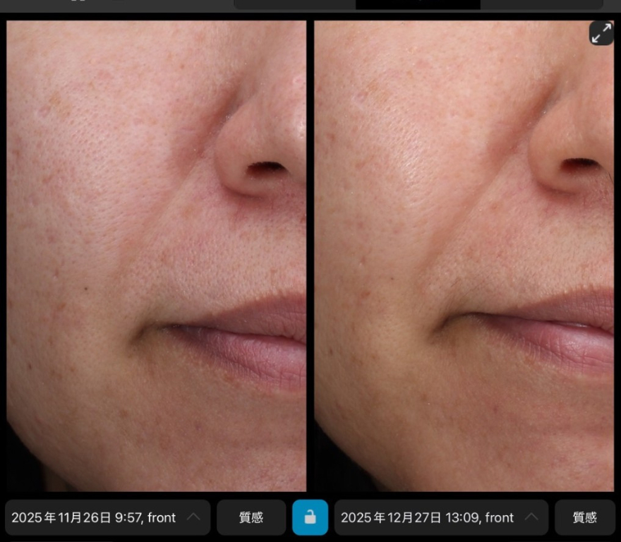 肌のハリ感◎ビジア上ではシワ、質感スコアの改善と肉眼的にも顔全体のキメが整い+トーンup